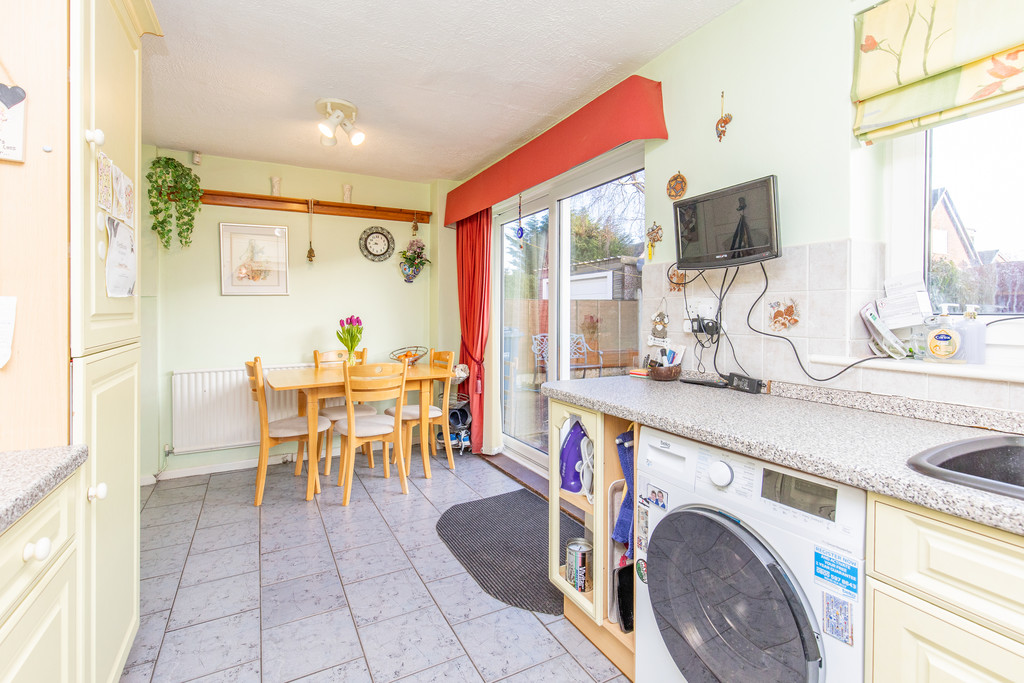 To the rear, there is a generous dining kitchen offering an excellent space for both everyday living and entertaining. The kitchen is fitted with a range of cabinets complemented by coordinating worktops, with space and plumbing for a washing machine, space for a freestanding cooker, and an integrated fridge/freezer. There is ample room for a dining table and chairs, and sliding patio doors open directly onto the rear garden, allowing plenty of natural light to flood the space.