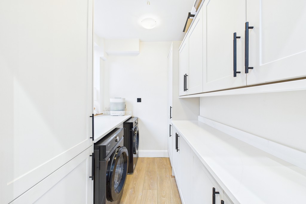 The superb family dining kitchen is fitted with stylish white shaker-style units complemented by white worktops and a range of integrated appliances, including a dishwasher, wine fridge, hob, electric oven and microwave. A breakfast bar provides informal seating, while patio doors open directly onto the rear garden, creating a seamless connection between indoor and outdoor spaces. A separate utility room adds further practicality and storage.
