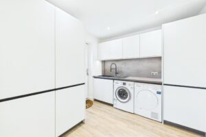 The family kitchen truly is the heart of the home-a beautifully designed space that combines style, functionality, and comfort. Finished to an exceptionally high standard, it features bespoke cabinetry, sleek stone worktops, integrated appliances, and a generous central island-perfect for both entertaining guests and everyday family living. The space is flooded with natural light, thanks to large sliding doors that open out to the garden, and two full-length windows in the family area, which further enhance the bright and airy atmosphere.