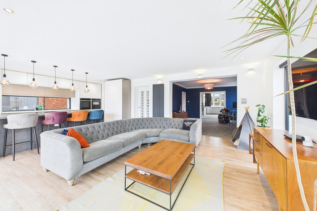 The family area itself offers a comfortable and relaxed space, with room for a large sofa-ideal for unwinding, catching up on the day's events, or simply enjoying the garden views. This whole area flows effortlessly onto a spacious patio, making it perfect for alfresco dining, barbecues, or soaking up the outdoors in warmer months.