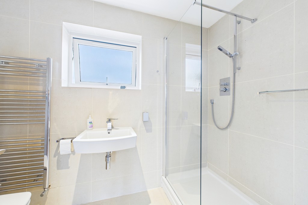 The primary bedroom benefits from a modern ensuite shower room, while bedrooms two and three are fitted with built-in wardrobes, offering ample storage solutions. The family bathroom is beautifully appointed with a four-piece suite, including a freestanding claw-foot bath and a separate shower cubicle, all finished to a high standard.