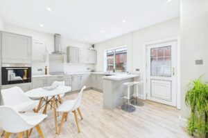 The property opens into a vestibule, leading through to a bright and spacious living room featuring a large window that floods the room with natural light. To the rear is a stylish, large open-plan dining kitchen, newly fitted with modern units, featuring a dedicated bar seating area, and integrated electric oven and hob, with plumbing for a washing machine and space for a fridge freezer - ideal for entertaining or family meals.