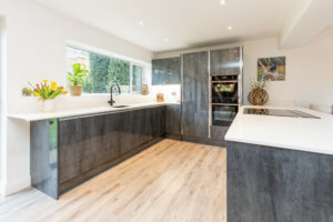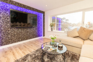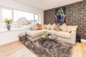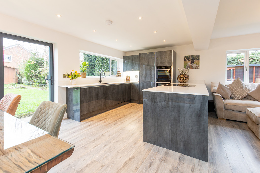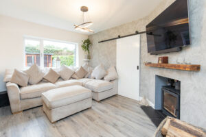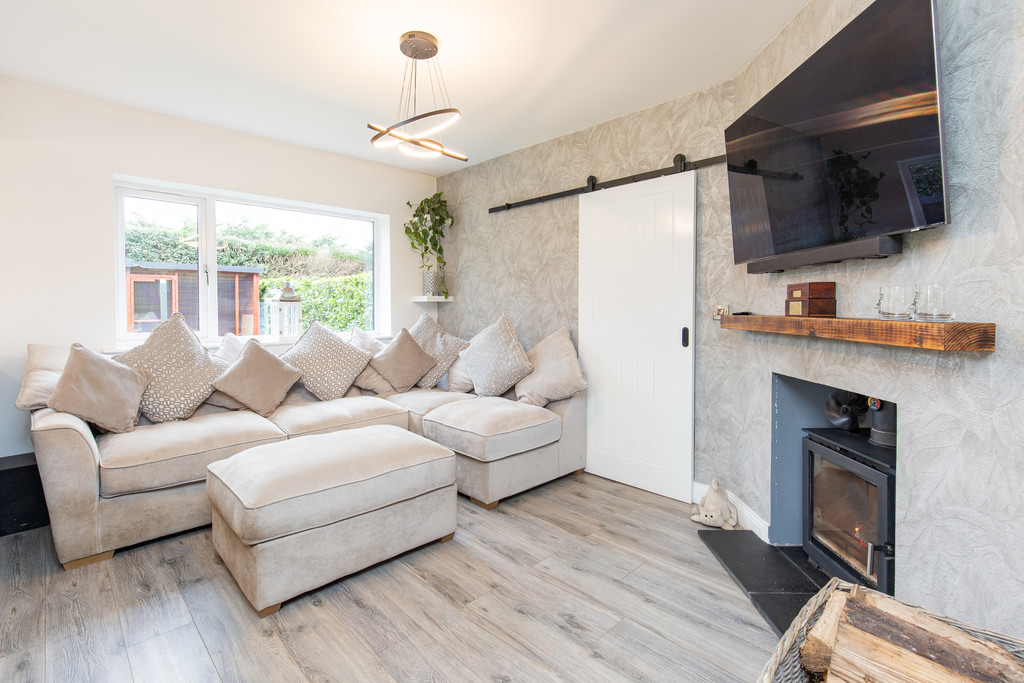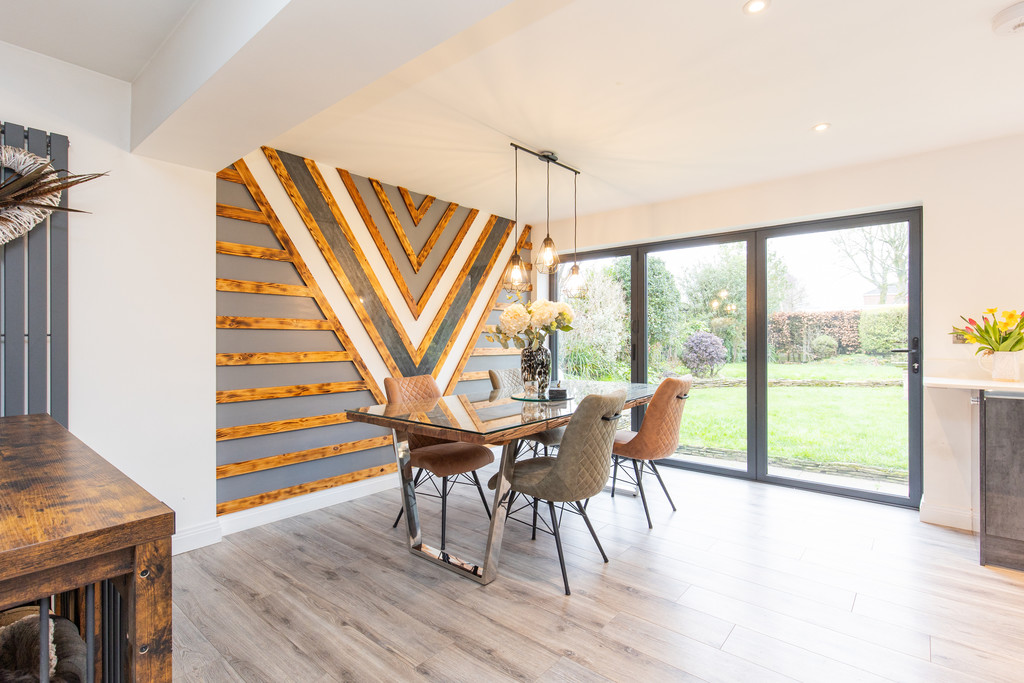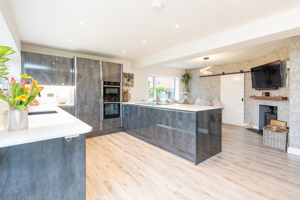 A standout feature of the home is the open-plan family dining kitchen, designed for modern living and entertaining. The kitchen is fitted with stylish quartz work surfaces and a range of integrated Neff appliances, including a dishwasher, fridge freezer, hob, double electric ovens and a convenient hot water tap. The main living space includes a comfortable lounge with a feature wood-burning stove, creating a warm and inviting focal point. The dining area enjoys plenty of natural light and is enhanced by feature panelled walling and bi-fold doors that open out onto the south-facing rear garden, seamlessly connecting indoor and outdoor living.