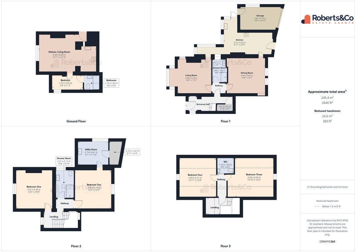 The main residence offers spacious accommodation over three floors and includes four double bedrooms, two generous reception rooms, a modern fitted kitchen, utility room, ground floor shower room, first floor family shower room, and an additional WC on the second floor. A garage, private courtyard, and tiered rear garden further complement the home.