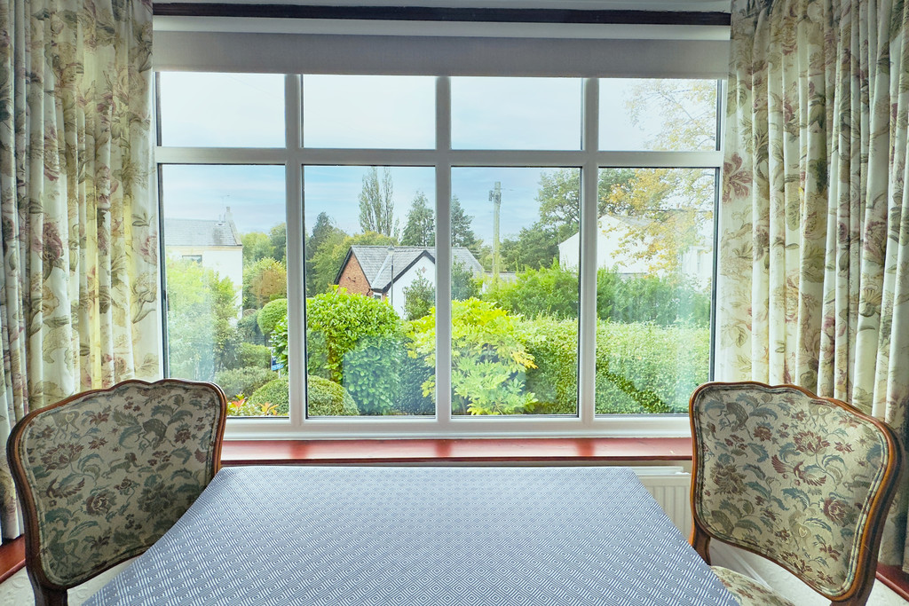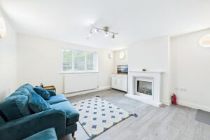 The living room is bright and inviting, featuring a large window that floods the space with natural light and offers views over the garden. A striking feature fireplace adds a charming focal point to the room.