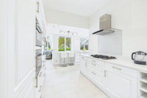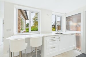 The contemporary breakfast kitchen is fitted with sleek white gloss units and complementary worktops. It includes a gas hob, double electric oven, and an integrated fridge-freezer. A breakfast bar enjoys lovely views of the garden, and there is convenient access to the side courtyard and the garage.