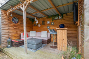 Externally, the property benefits from driveway parking for two vehicles, along with well-maintained gardens to both the front and rear. The rear garden is particularly well suited for entertaining, featuring an outdoor bar area, additional seating space, and a storage shed, making it ideal for social gatherings and summer enjoyment.