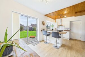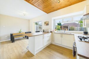 The ground floor accommodation begins with a welcoming porch and entrance hallway, leading through to a bright and comfortable living room positioned at the front of the property, featuring an attractive electric stove that creates a warm focal point. To the rear, the spacious dining kitchen spans the width of the house and is well-equipped with an integrated oven and grill, and gas hob. A breakfast bar provides additional seating and functionality, making the space ideal for both everyday living and entertaining. The dining area benefits from large patio doors that open directly onto the rear garden, allowing plenty of natural light and seamless indoor-outdoor living.