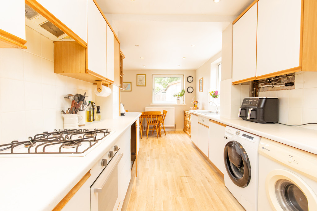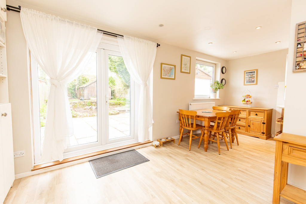 A well-proportioned dining kitchen, providing ample space for both cooking and family dining, with patio doors opening directly onto the rear garden, seamlessly connecting indoor and outdoor living.