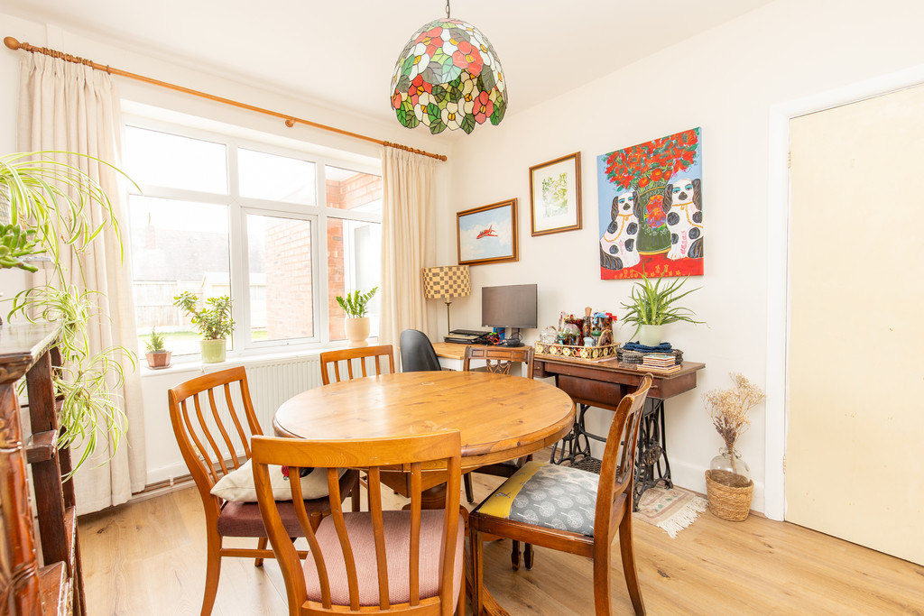 The property includes two double bedrooms and a single bedroom. At the front, there is a driveway providing off-road parking. The entrance hall leads to a front-facing living room and a rear dining room, creating a flexible space for relaxing and dining.