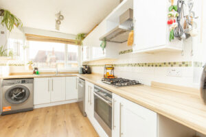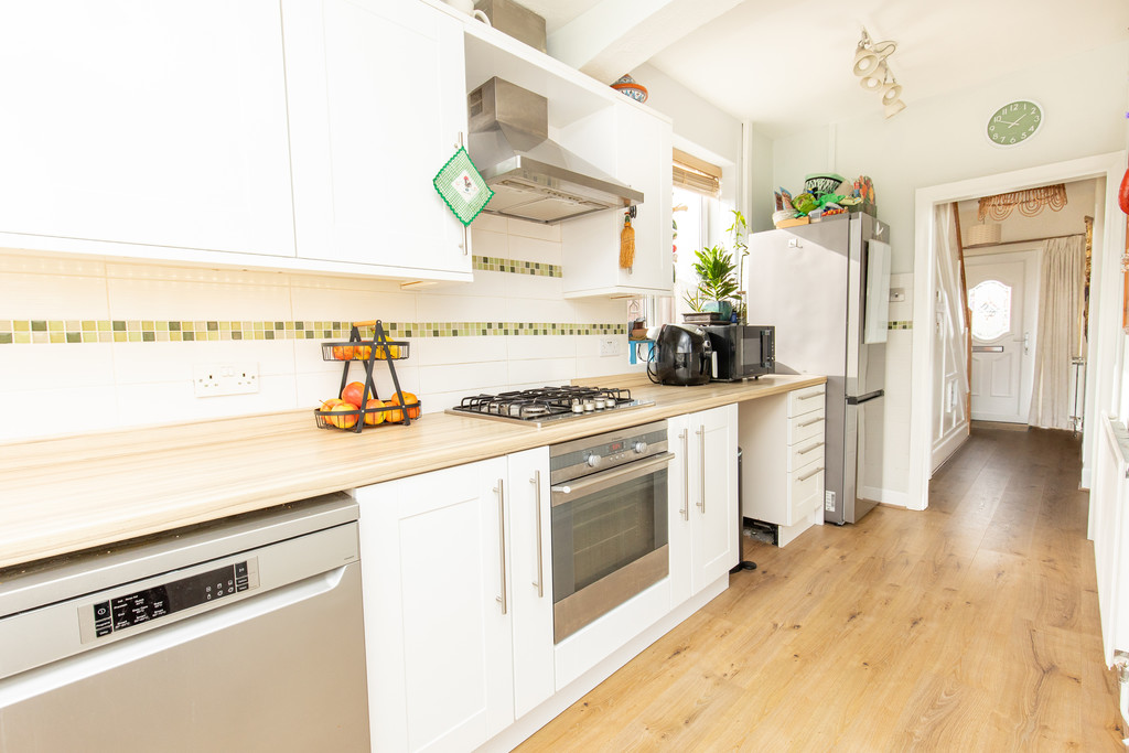 The modern fitted kitchen features white shaker-style cabinets paired with wood-effect worktops. It includes a gas hob, electric oven, and space and plumbing for both a washing machine and dishwasher, along with room for a tall fridge-freezer and additional under-counter appliances. A convenient downstairs WC is also located on this level.