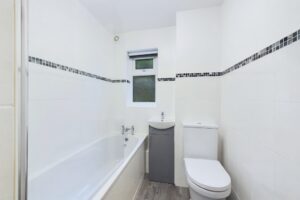 The recently installed bathroom has been finished to a high standard, offering a stylish modern suite complete with a shower over the bath.