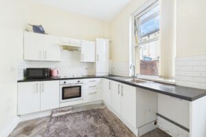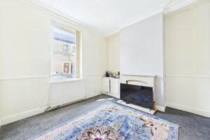 To the rear, the fitted kitchen features ample worktop and storage space, with plumbing for a washing machine and room for a freestanding fridge freezer. The layout provides a practical flow and easy access to the enclosed rear yard, perfect for outdoor seating or additional storage.
