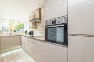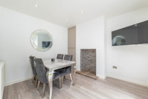 To the rear, the home boasts an open-plan dining kitchen, fitted with sleek gloss units complemented by contrasting work surfaces. Integrated appliances include an electric oven and hob, as well as a fridge and freezer, making it both practical and modern. The kitchen flows seamlessly into the dining area, which features a striking chimney breast and patio doors that open onto the landscaped rear garden, creating a perfect space for entertaining or relaxing.