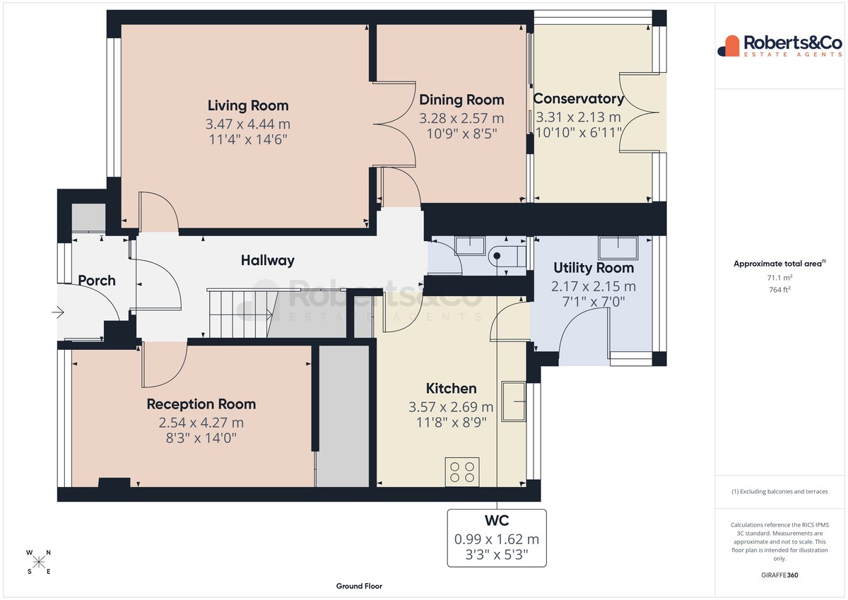 The breakfast kitchen offers space for a freestanding cooker, dishwasher, and under-counter fridge and freezer, along with a breakfast bar seating two. A separate utility room provides plumbing and space for a washing machine and additional fridge, and there is also a convenient downstairs WC.