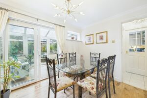 This spacious family home is entered via a porch, complete with a built-in storage cupboard for shoes and coats, leading into a welcoming hallway. The main living room features an electric fire and opens seamlessly into the dining room, creating an excellent flow for both everyday living and entertaining. Sliding doors from the dining room lead directly into the conservatory, which enjoys delightful views over the rear garden and provides an additional versatile reception space.